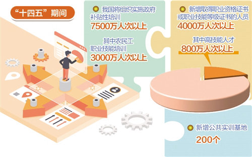 在1月7日举行的国务院政策例行吹风会上,人力资源社会保障部副部长汤涛表示,为提升劳动者就业创业能力,满足产业转型升级和技术进步的要求,“十四五”期间,我国将组织实施政府补贴性培训达7500万人次以上,其中农民工职业技能培训3000万人次以上;新增取得职业资格证书或职业技能等级证书的人员达到4000万人次以上,其中能够达到高级技工、技师、高级技师的高技能人才达到800万人次以上;新增公共实训基地200个。