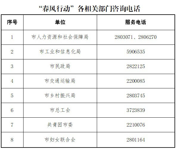 日前,市人社局、工信局、民政局、交通运输局、乡村振兴局、总工会、团市委、妇联等八部门发出通知,在全市联合开展“2022年春风行动”。